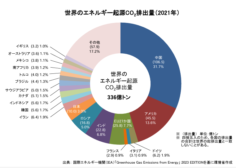 中国とインドのCO2排出量は全世界の「約4割」と、全世界のCO₂の排出国のなかでも特出して多いことがわかります。