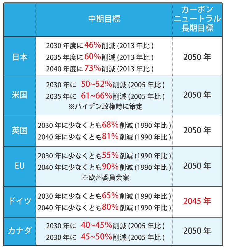 各国の削減目標は「日本は2013年に対して46%」「ドイツは1990年に対して65%」など「いつに対して何%削減するのか」という対象年が異なります。