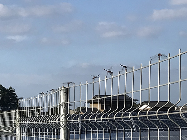 点検中の合間ですがふとフェンスを見ると赤とんぼが一杯並んでいました。